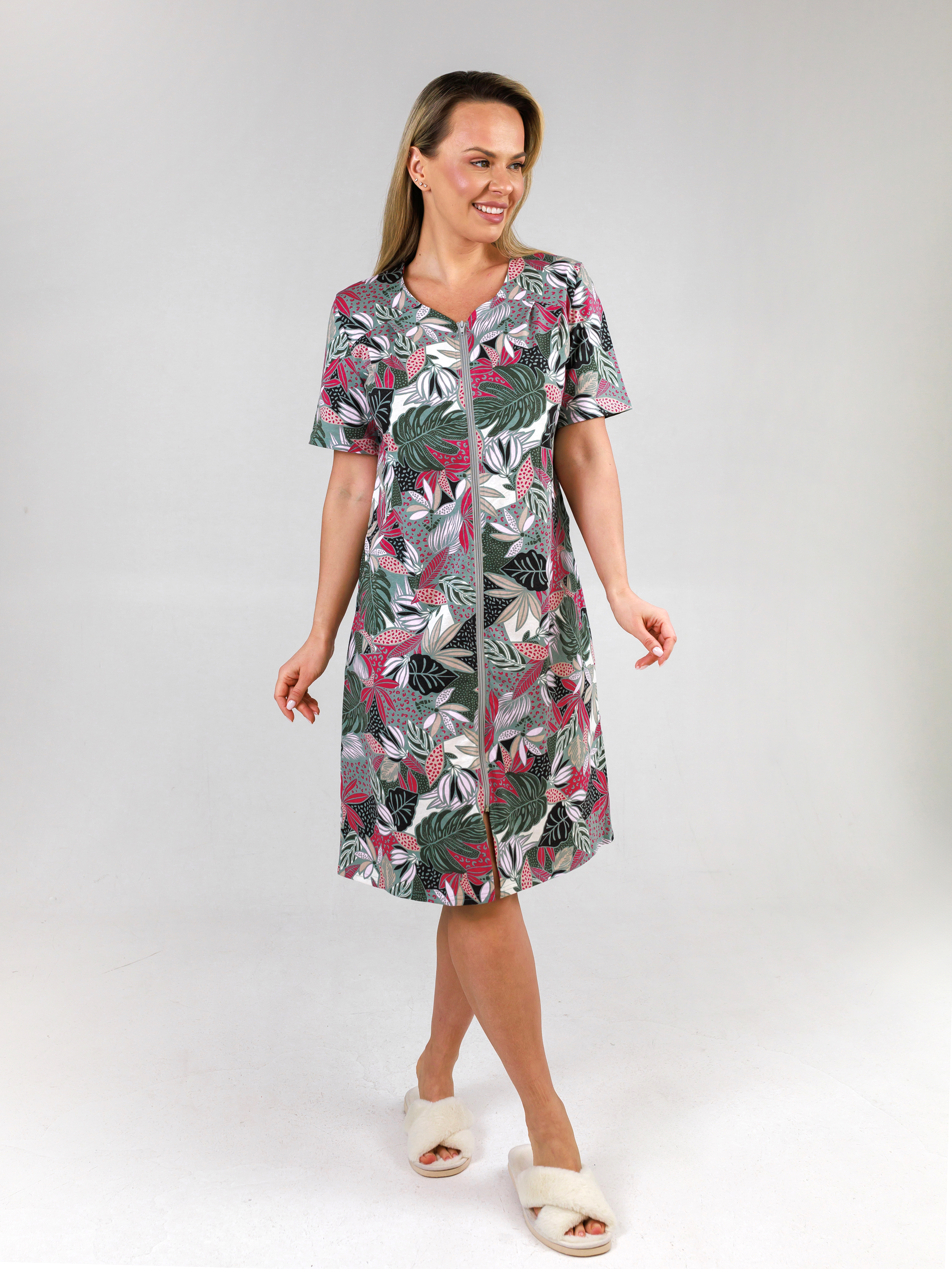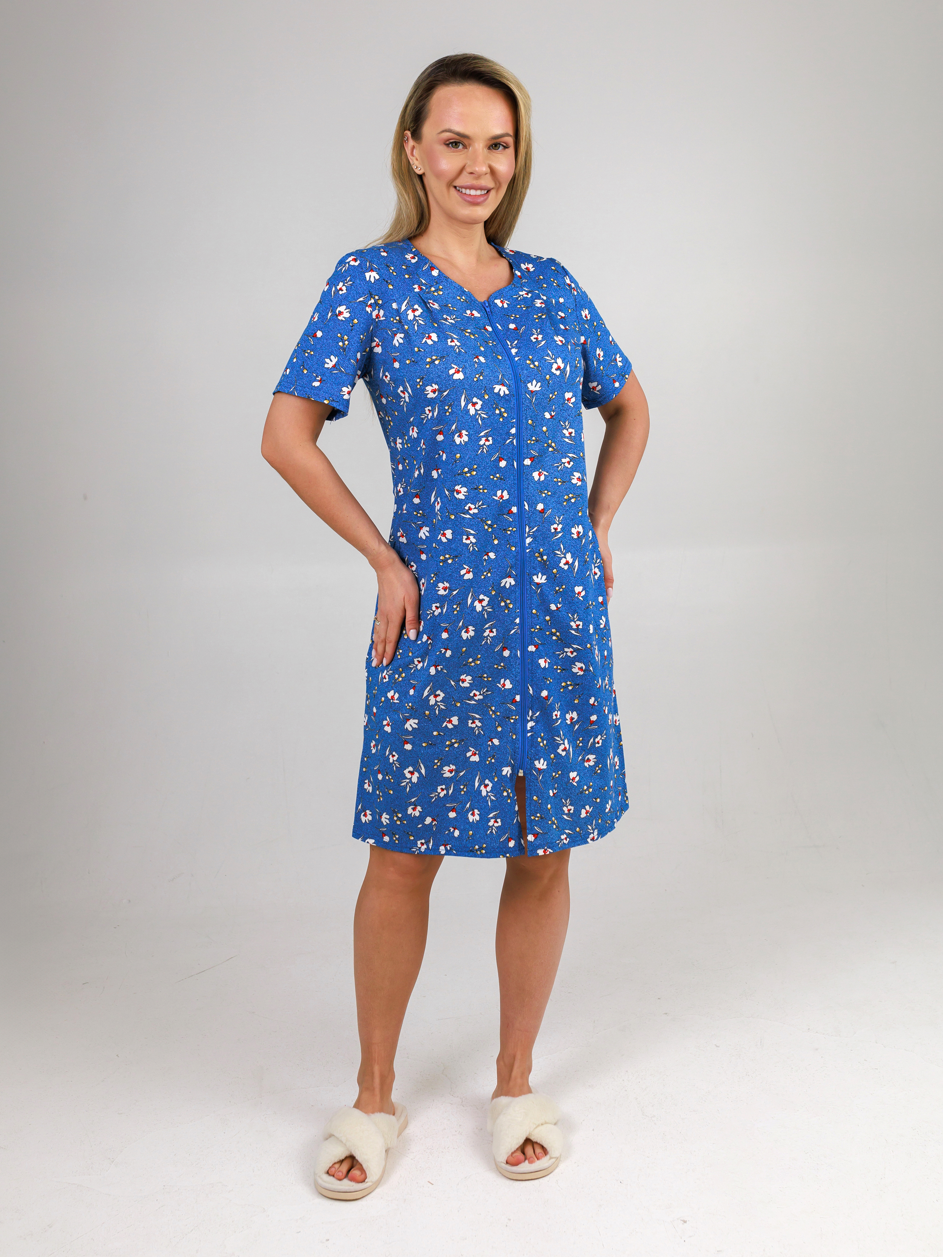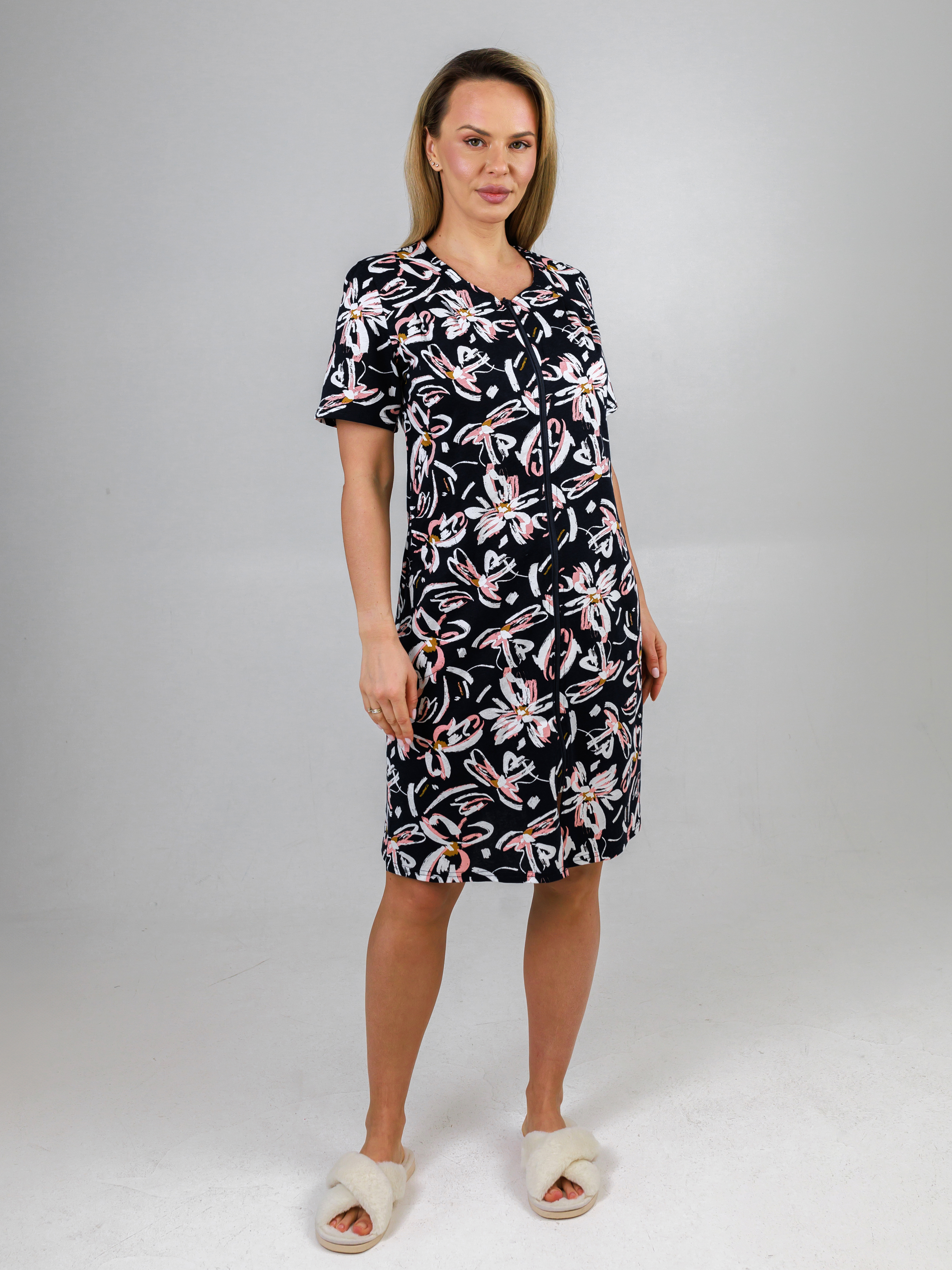 Легкий летний халат с карманами прилегающего силуэта из тонкого трикотажного полотна. Застежка на тесьму-молнию. Рукав короткий втачной.