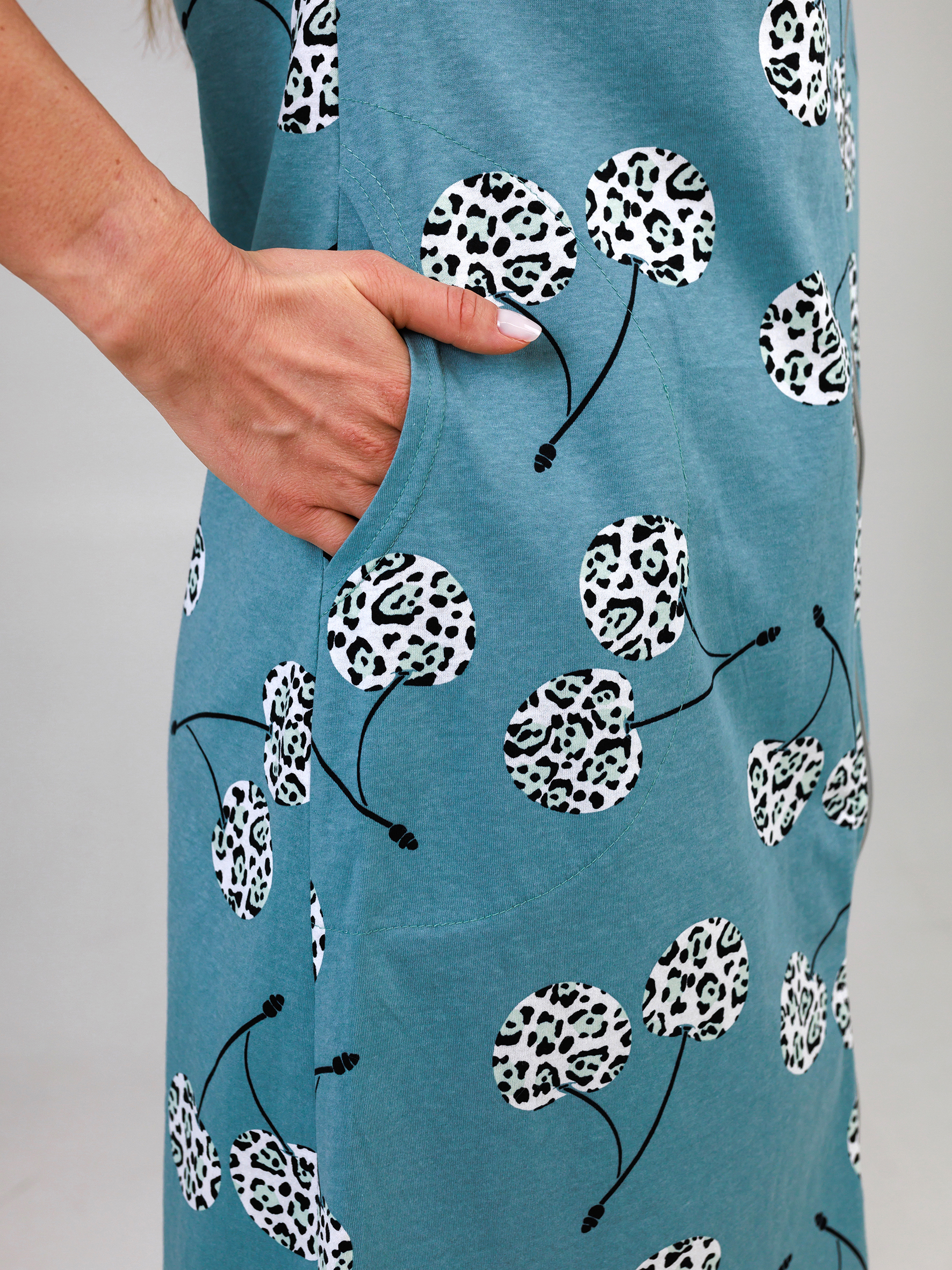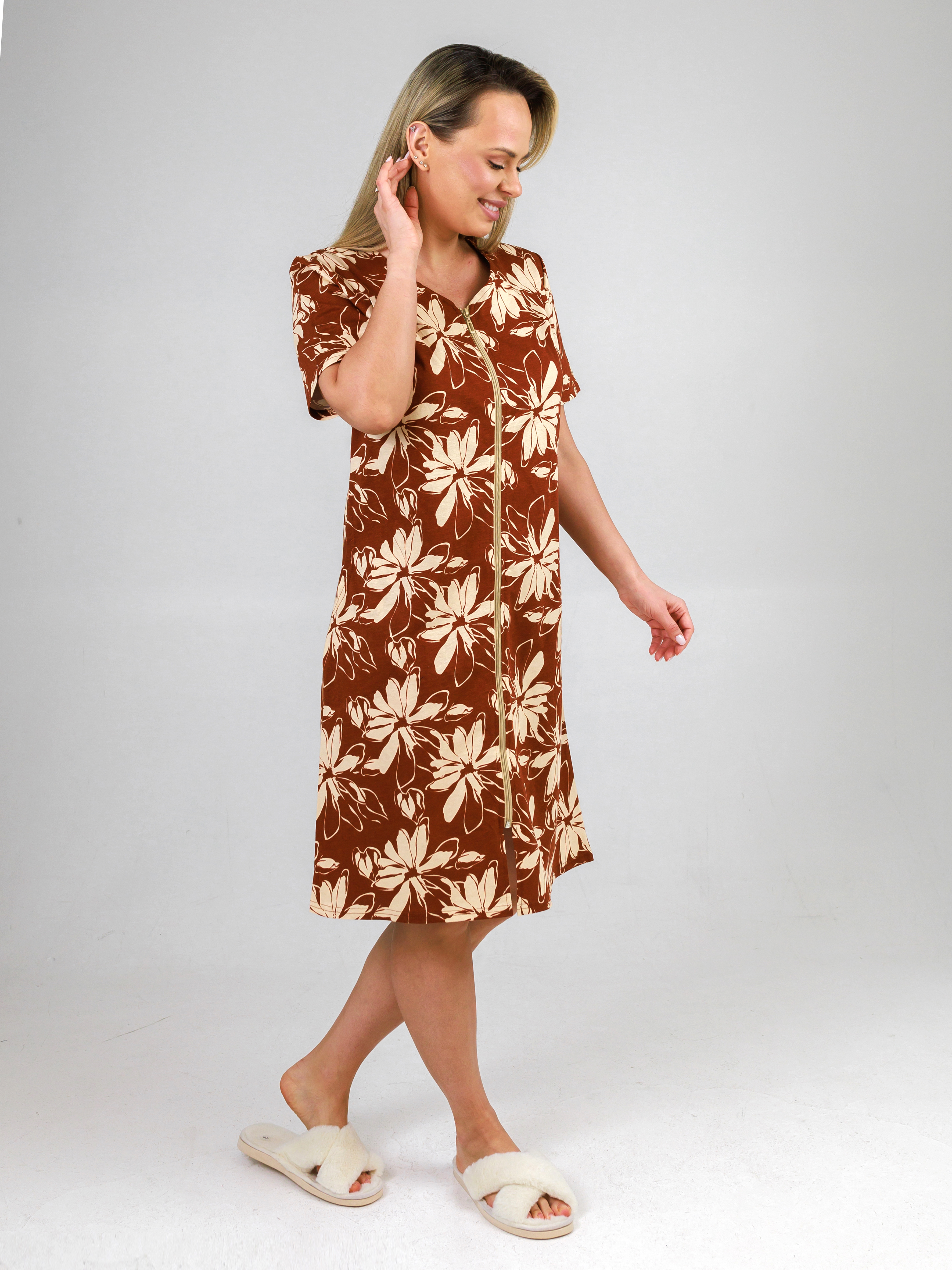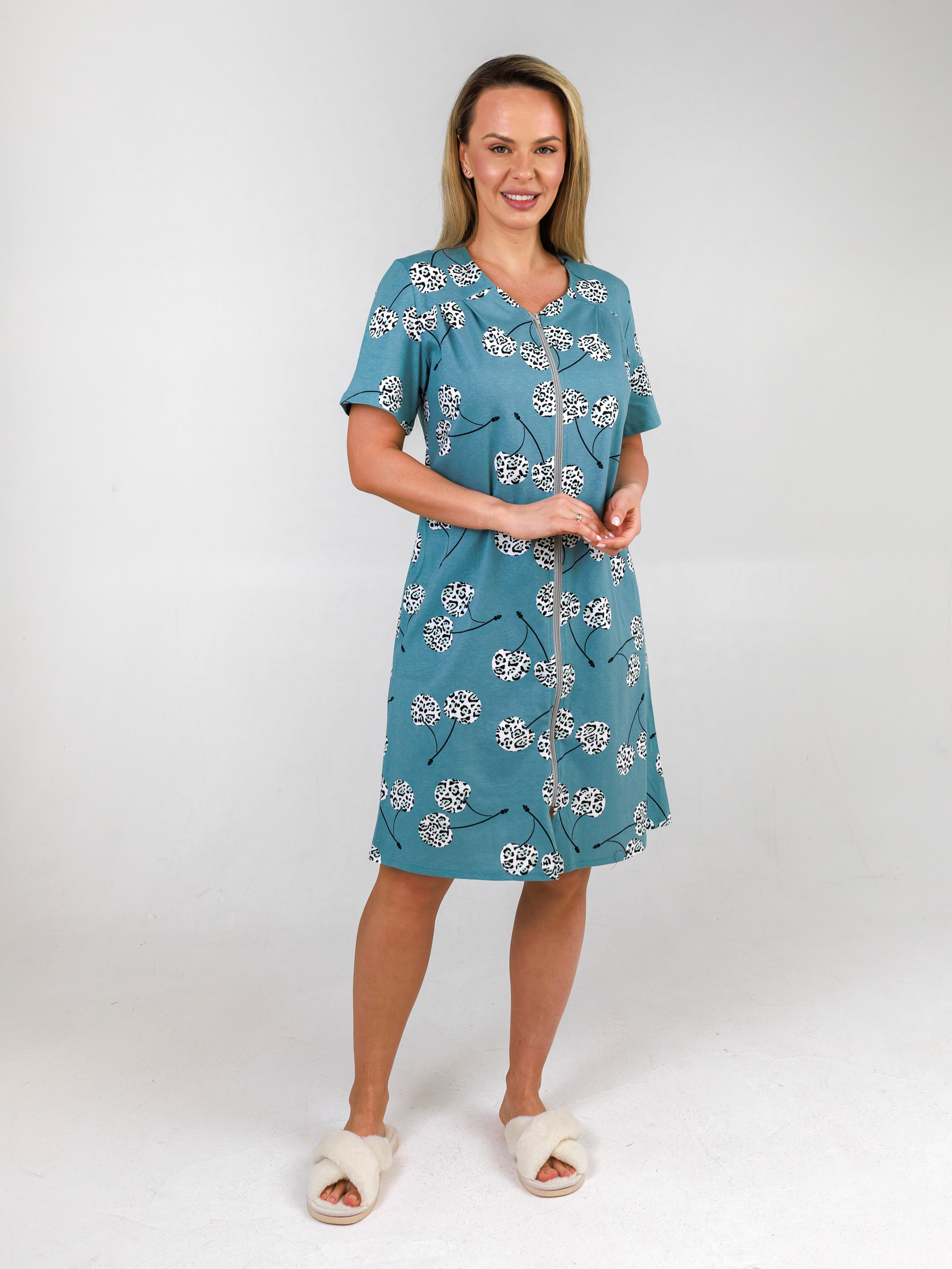 Легкий летний халат с карманами прилегающего силуэта из тонкого трикотажного полотна. Застежка на тесьму-молнию. Рукав короткий втачной.